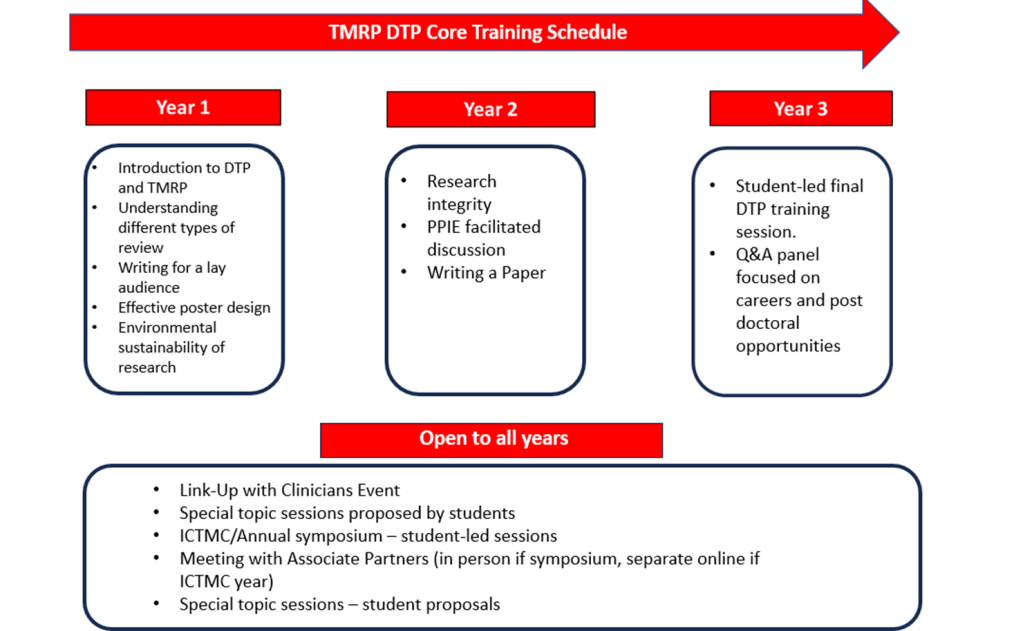 We offer a mixture of online and in-person sessions across the period of the studentship. Our core training matrix is below: